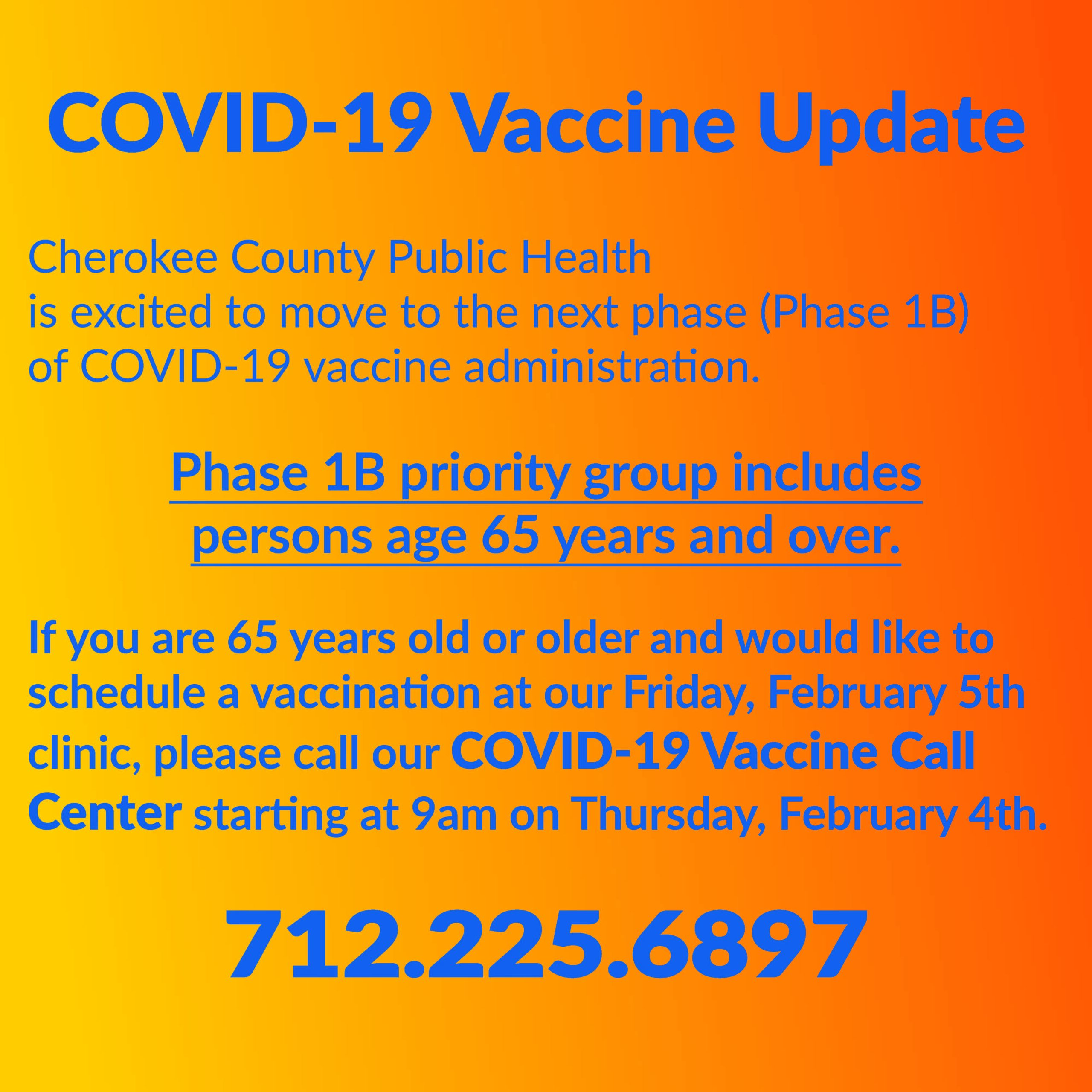 Again, anyone falling into the Phase 1-B age 65 and older population group that is interested in scheduling an appointment for the February 5, 2021 COVID- 19 vaccination clinic needs to call (712) 225-6897 starting at 9:00 a.m. on Thursday, February 4, 2021. Keep in mind Cherokee County Public Health will have a very limited supply and this clinic date will fill up appointments quickly. Additional clinics will be scheduled in the following weeks as more vaccine becomes available.